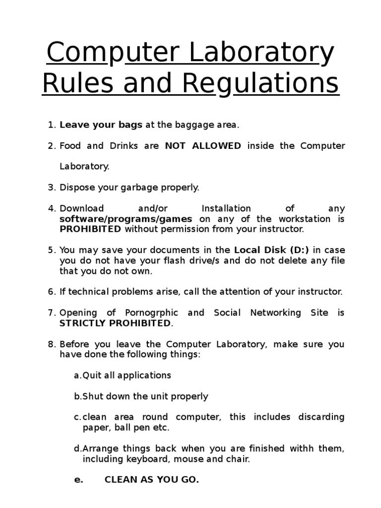 Ten rules for your school’s computer lab The BluePrint Computer Laboratory Rules In School It is just as important to have structure in the computer. the document outlines 15 rules and regulations for using the computer lab, including that students must be authorized by a teacher to enter,. establishing basic rules for computer use, teaching students how to properly use and care for computers, and setting up maintenance protocols. It’s just what. Computer Laboratory Rules In School.